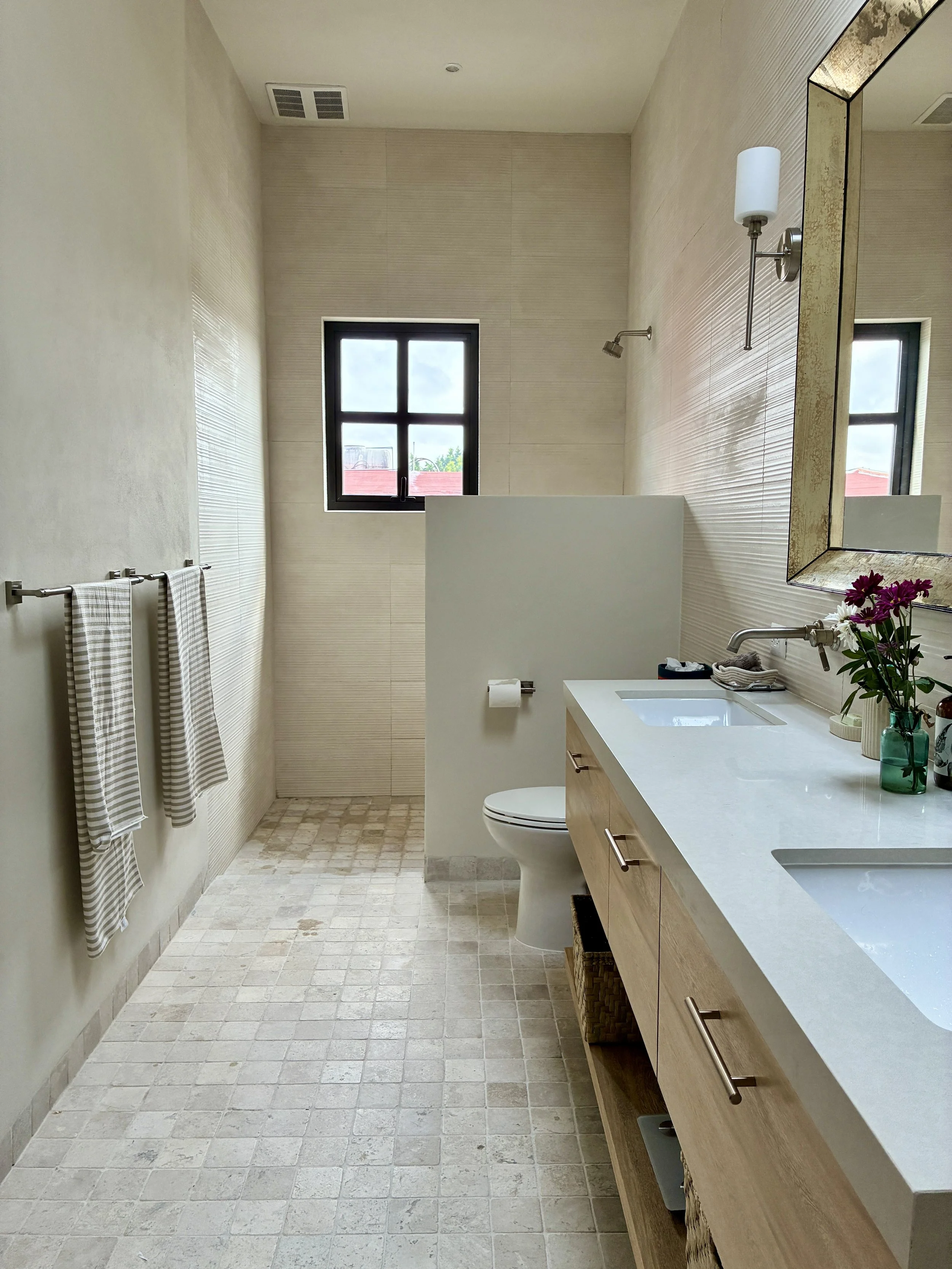 This sweet bedroom with its handmade twin beds, taupe and navy bedding, mesquite bench and ample closet space is perfect for friends or children sharing a room. The ensuite bathroom has a single sink, shower and plenty of sunshine from the southern exposure. Double doors lead to the 2nd-floor terrace with its potted olive trees, seating areas, and easy access to the pool below.