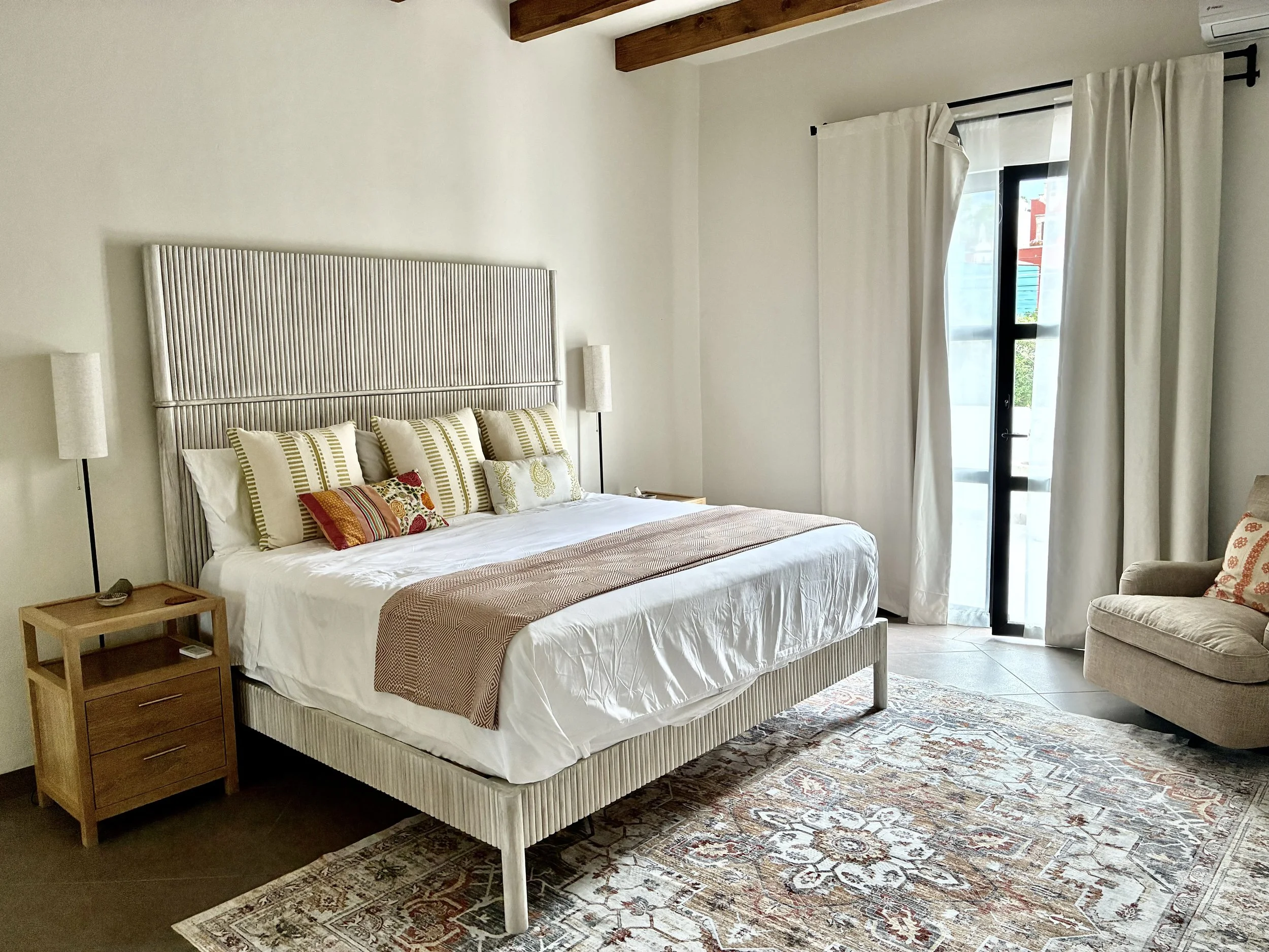 El Principal is the home’s largest bedroom with a king-size iron canopy bed, oriental rug, a cozy corner for reading, and a lovely ensuite bathroom with double sinks, shower and a soaking tub (the home’s sole bathtub). From this room, you’ll enjoy a view of San Miguel’s iconic pink Parroquia from both the shower and bed (yes!) and from French doors leading to a small street-side balcony. There is also a window looking onto the interior courtyard and a large walk-in closet.